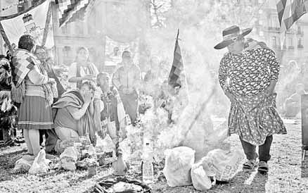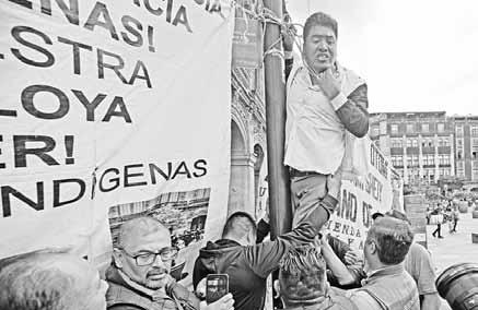 ▲ Vicente Hernández, procedente de Santiago Mexquititlán, Querétaro, intentó en varias ocasiones prenderse fuego durante una protesta de integrantes de las comunidades otomí, triqui, mazahua y nahua frente a la sede del Gobierno capitalino, porque no se les incluyó en la novena Feria de las Culturas Indígenas, Pueblos y Barrios Originarios de la Ciudad de México, instalada en la plaza de la Constitución y que ayer se abrió al público. El hombre alcanzó a empaparse de combustible, pero antes de que activara el encendedor bomberos lo bañaron con espuma. Foto Alfredo Domínguez