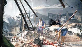 Alrededor de 570 locales fueron destruidos en la nave central del inmueble, informaron autoridades. El fuego comenzó alrededor de la una de la madrugada del lunes en los puestos semifijos ubicados en la parte trasera del mercado. No hay reportes de heridos o fallecidos. ‘‘Perdimos todo’’, expusieron algunos comerciantes. Foto Cuartoscuro. HÉCTOR BRISEÑO / P 26