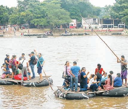 ▲ Antes del amanecer, cientos de personas cruzan de Guatemala a México por el río Suchiate en balsas rudimentarias, a la vista de elementos de la Guardia Nacional, en busca de una vida digna