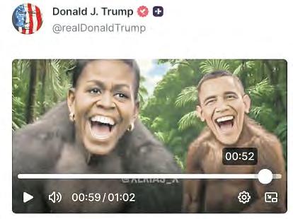 El presidente de Estados Unidos desató ayer furia e indignación entre los demócratas después de publicar en su red Truth Social un video que mostró al ex mandatario Barack Obama y su esposa como monos en una jungla, el cual es parte de un meme creado por un influyente derechista. Foto tomada de X