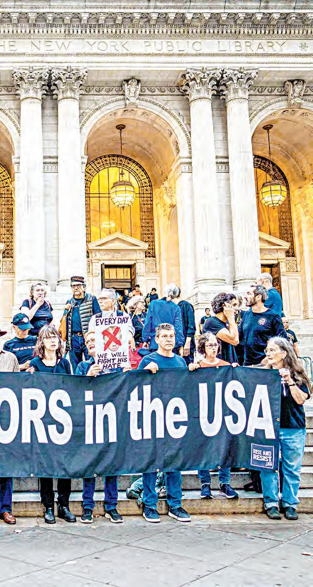 ▲ Miembros del grupo activista Rise and Resist sostienen una pancarta en la cual se lee: “no hay dictadores en Estados Unidos”, en las escaleras de la Biblioteca Pública de Nueva York. Foto Afp
