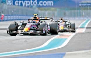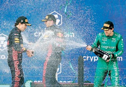 El conductor neerlandés sumó su tercera victoria en la temporada, tras remontar desde el noveno sitio. La superioridad del equipo de Red Bull fue abrumadora. El piloto mexicano estuvo en la punta, pero por el cambio de neumáticos no pudo contener a su coequipero. Foto Ap.