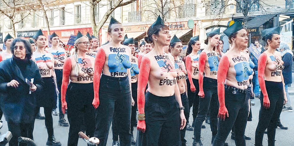 ▲ Con las banderas de Rusia, Estados Unidos y la Unión Europea, así como la leyenda “Epidemia fascista”, dibujadas sobre su torso desnudo, activistas del grupo Femen participaron en la marcha por el 8M en París, Francia. A su vez, en la Ciudad de México, decenas de miles colmaron las calles del Centro Histórico en defensa de sus derechos, ataviadas con alguna prenda del característico color morado y consignas como “Ni puta por coger, ni madre por deber, ni muerta por mujer”. En el trayecto de la manifestación, algunas rociaron con pintura en aerosol las vallas colocadas a lo largo de Reforma, Juárez, 5 de Mayo y Zócalo, donde al final del acto encendieron fogatas alimentadas por las pancartas que llevaban y luego bailaron, se abrazaron y proclamaron: “esta lucha nos hermana”. Fotos Afp, María Luisa Severiano, Yazmín Ortega Cortés y Jair Cabrera