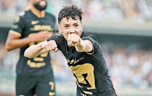 Jorge Ruvalcaba celebra tras anotar el tercer gol. El cuadro auriazul salió ovacionado al doblegar al Atlético San Luis. Fue la primera victoria de los felinos desde hace cuatro encuentros y se acercaron a la zona de repesca con 14 unidades. Foto Víctor Camacho. ERENDIRA PALMA / DEPORTES