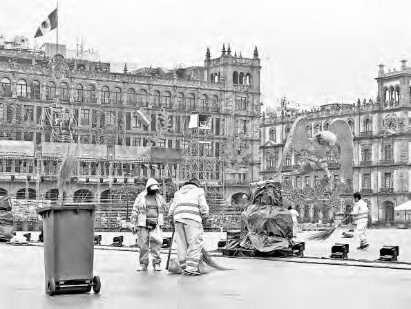 ▲ Con el clima de ayer por la mañana fue necesario estar activo y una opción fue limpiar la plancha del Zócalo. Foto Roberto García Ortiz
