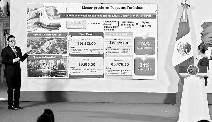 Describió dos de los 10 paquetes con cuatro días y tres noches. Uno llamado “Joyas de la cultura mesoamericana”, que incluye recorridos por el parque El Jaguar, en Tulum; por la Laguna de los Siete Colores, de Bacalar, y por la zona arqueológica de Calakmul, Campeche, con un costo de 8 mil 916 pesos, más bajo que los 13 mil 478 promedio de la oferta actual en otras empresas. Asimismo, el de “La ruta de las maravillas”, con visitas a Mérida y Valladolid, y a las zonas arqueológicas de Ek Balam y Chichén Itzá, cuyo precio será de 14 mil 512 pesos, casi 5 mil menos que la competencia. Lozano Águila indicó que habrá actividades, promociones y concursos para conmemorar el primer aniversario del Tren Maya, que fue inaugurado el 15 de diciembre de 2023 por el entonces presidente Andrés Manuel López Obrador, con un recorrido de la estación Mérida-Teya a Cancún.