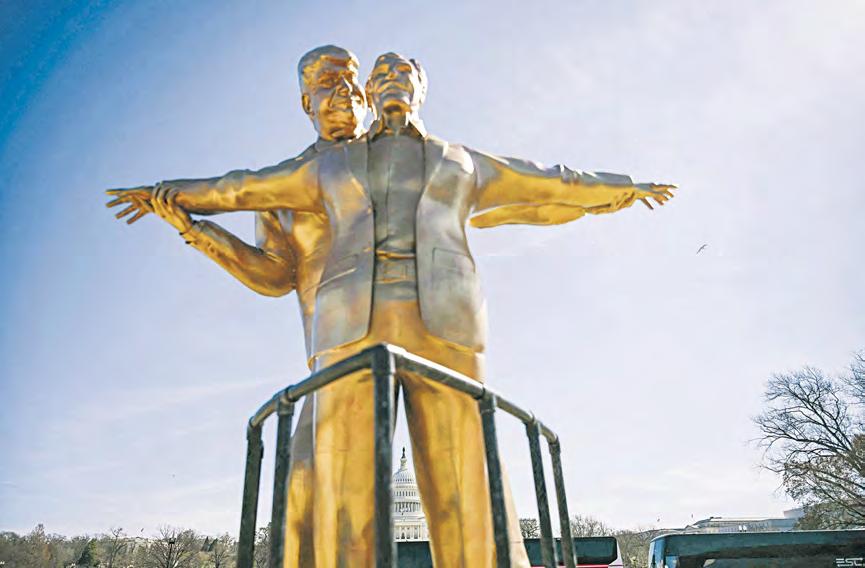 ▲ Una estatua que muestra al presidente Trump y al fallecido delincuente sexual Jeffrey Epstein fue instalada ayer en el National Mall, cerca del Capitolio de Estados Unidos. La escultura, titulada