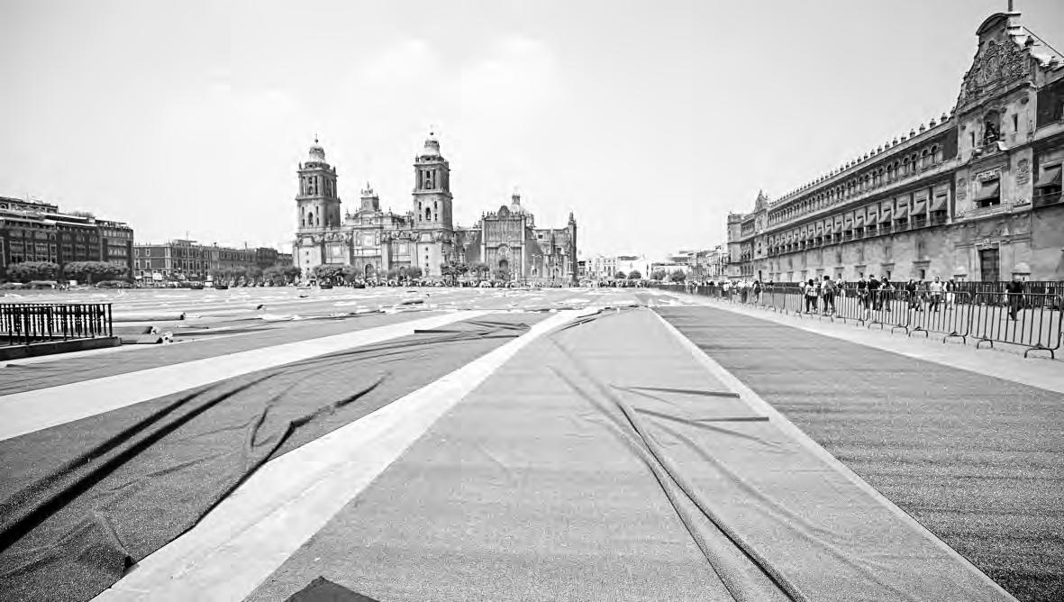 ▲ Con la instalación de enormes lienzos de pasto artificial en dos tonalidades, la plancha de la Plaza de la Constitución se pintó de verde con motivo de la clase masiva de futbol que se impartirá el 15