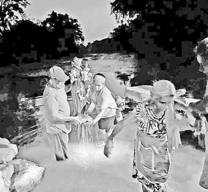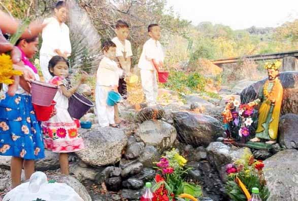 ▲ Vestidos con atuendos tradicionales, niños y niñas de la comunidad náhuatl de Cuapaxtitla colocaron una ofrenda en el río que cruza la localidad, el cual está prácticamente seco, para atraer la lluvia. Acompañados de sus padres, recrearon rituales de sus ancestros, que
