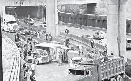 ▲ Un camión de carga que circulaba por carriles centrales del periférico Adolfo López Mateos a la altura de Chapultepec se quedó sin frenos y golpeó