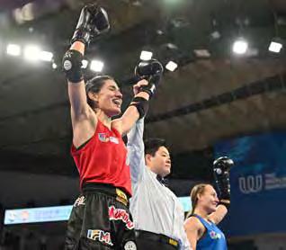 t La mexicana derrotó 29-28 a la polaca Martyna Kierczynska en la final de la categoría de 54 kilogramos de muay thai en la justa de Chengdú, China. “La arena estaba llena y la atmósfera fue increíble. Creo que dimos un buen espectáculo y eso me pone muy feliz. Se logró la meta”, dijo la bicampeona mundial. Foto Xinhua aDRiana Díaz / DePortes