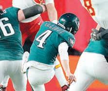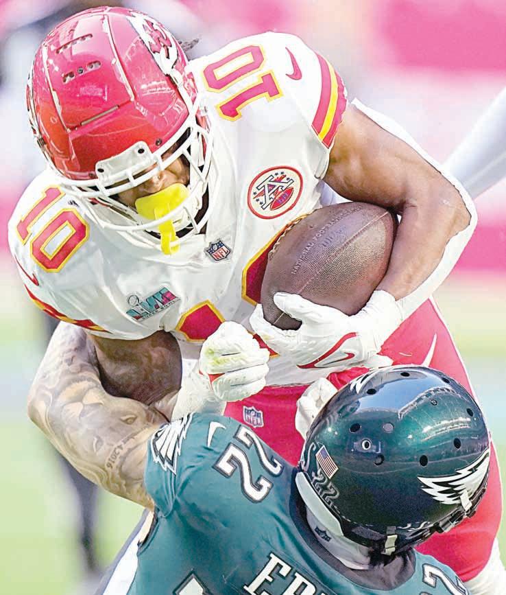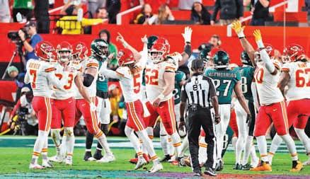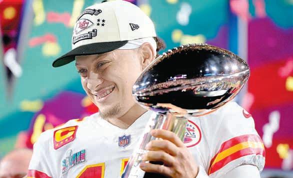 ▲ En uno de los juegos más dramáticos de los años recientes, los Jefes, encabezados por el extraordinario mariscal Patrick Mahomes (15), lograron el tercer título de su historia, el segundo en tres años, al derrotar 38-35 a las Águilas de Filaldelfia en la edición 57 del