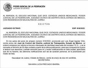 En el lugar en que se encuentren, hago saber a Ustedes que: En los autos del juicio oral mercantil 303/2022, del índice de este Juzgado Quinto de Distrito en Materia de Extinción de Dominio con competencia en la República Mexicana y Especializado en Juicios Orales Mercantiles en el Primer Circuito, con sede en la Ciudad de México, promovido por “SOFOM INBURSA”, Sociedad Anónima de Capital Variable, Sociedad Financiera de Objeto Múltiple, Entidad Regulada, Grupo Financiero Inbursa, por conducto de su apoderado legal Edgar Noé Olivares Pineda, y toda vez que por acuerdo de dieciocho de enero de dos mil veintitrés, se ordenó su emplazamiento por medio de edictos, que deberán publicarse por tres veces consecutivas, en un periódico de circulación amplia y de cobertura nacional, y uno diverso de circulación local, correspondiente a esta entidad federativa, de conformidad con lo dispuesto en los artículos 1068, fracción IV, y 1070, último párrafo, del Código de Comercio, se le hace saber que podrá presentarse ante este Juzgado dentro del término de treinta días, contado a partir del día siguiente al de la última publicación del edicto, a efecto de hacer valer sus derechos, con el apercibimiento de que si no comparece mediante escrito, o por sí, se procederá en términos de lo dispuesto en los artículos 1390 Bis 16 y 1390 Bis 20 de la legislación mercantil y se proseguirá el juicio en todas ordenamiento jurídico invocado, quedando a su disposición en la Secretaria de este Juzgado Federal copia simple de la demanda y de los documentos base de la acción; asimismo, se informa que en el juicio oral mercantil 303/2022, la parte actora demanda las siguientes prestaciones: