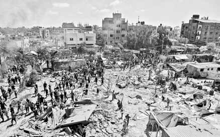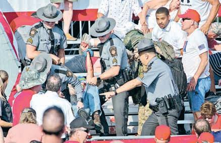 arenga a la multitud después de incorporarse una vez que cesaron los disparos. Abajo, es retirado del escenario por los agentes que lo llevaron a un hospital. Fotos Ap y Afp