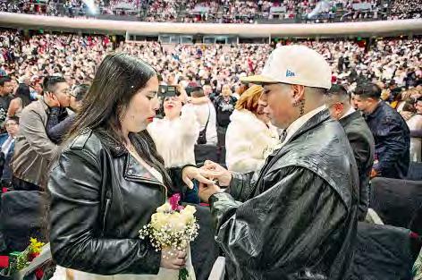 ▲ La Comisión Ambiental de la Megalópolis acordó ayer por la tarde levantar las restricciones a la circulación de vehículos, medida que duró más de 50 horas. Sin embargo, esta situación no impidió los festejos por el Día del Amor y la Amistad en la capital del país. Ante la prohibición de las actividades al aire libre, ayer por la mañana 2 mil 738 parejas se trasladaron al Auditorio Nacional para la boda civil colectiva organizada por el gobierno local. Vestido de pachuco,