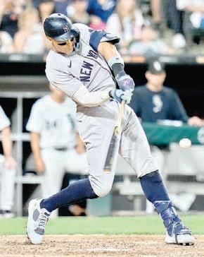 Aaron Judge conecta un doble en la séptima entrada del juego contra los Medias Blancas de Chicago. Foto Ap