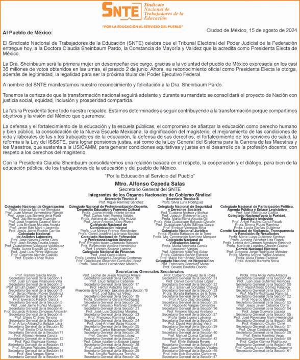 Por unanimidad, la sala superior del Tribunal Electoral del Poder Judicial de la Federación (TEPJF) declaró la validez de los comicios presidencial y del triunfo de Claudia Sheinbaum Pardo, quien será la primera presidenta de la República a partir del primero de octubre.