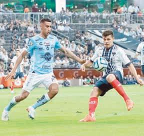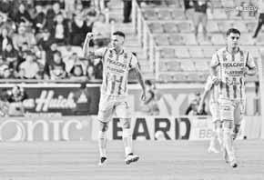 ▲ Édgar Méndez celebra con el puño en alto su primer doblete, con el que llega a tres goles en la temporada. Foto Liga Mx