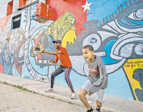 Con un vívido mural que narra su historia y creencias, dos niños y un par de hombres jóvenes, como de 30 años, juegan beisbol sin bat. Gritan y ríen felices, aventándose la pelota de un lado a otro, como si estuvieran danzando.