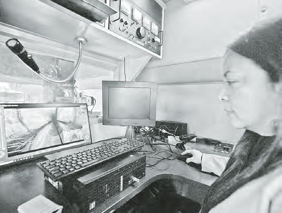 Desde una cabina instalada sobre la calle, sólo con un tramo de un carril parcialmente cerrado para estacionar las unidades con el equipo, técnicos observan en una pantalla el recorrido del robot dentro del túnel, sin necesidad de abrirlo,