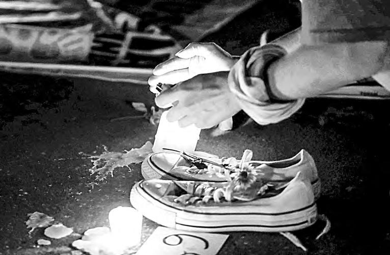 ▲ Madres buscadoras y familiares de desaparecidos de varios estados de la República reprodujeron con pintura el rancho de Jalisco en la plancha del Zócalo, con la colocación de zapatos para recordar los 400 hallados en el predio. Junto a cada uno de ellos pusieron flores, veladoras y algunas cruces. En la plaza de armas