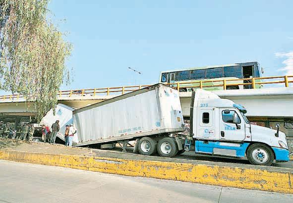 ▲ La caja de un tráiler que transportaba productos de limpieza quedó atorada en la vuelta de retorno de un puente de Río Churubusco, a la altura de Calle 12, colonia Granjas San Antonio, alcaldía Iztapalapa.