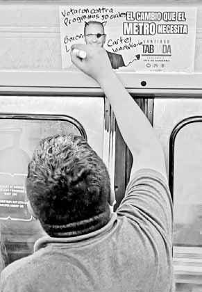 Un usuario del Metro manifiesta su rechazo al candidato de la coalición opositora Va por la CDMX, Santiago Taboada, por haber votado contra programas sociales y por el cártel inmobiliario. Foto Marco Peláez