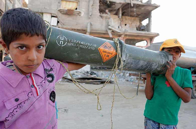 mientras las fuerzas armadas de Tel aviv bombardearon el corazón de Jabaliya, al norte de Gaza, donde se instaló un campo de refugiados, el primer ministro Benjamin natanyahu recalcó que ‘‘la batalla en rafah será decisiva’’. en la audiencia en la Corte internacional de Justicia de La Haya, donde sudáfrica acusa a israel de genocidio, se apremió a ordenar el cese el fuego para garantizar la sobrevivencia del pueblo palestino. en la imagen, niños muestran en Jan yunis un contenedor de municiones fabricado por eU. Foto afp. agencias / P 24