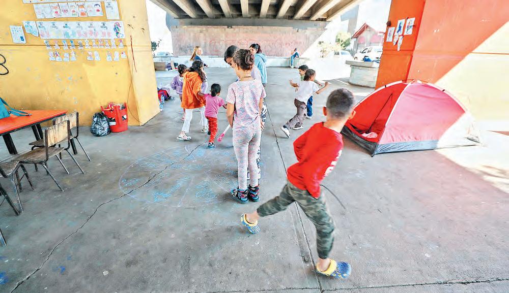 Bajo un puente, los niños reciben clases mientras esperan seguir hacia el norte