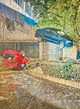 ▲ Tras la tormenta de ayer en el surponiente, en la colonia Atlamaya, alcaldía Álvaro Obregón, un vehículo quedó atorado en una reja y otro se volcó, debido al torrente que se formó en la zona. Se registraron inundaciones en vialidades como Periférico, Insurgentes, Revolución, Barranca del Muerto y Mixcoac, algunas incluso se volvieron intransitables. Foto tomada de redes sociales DE LA REDACCIÓN / P 34