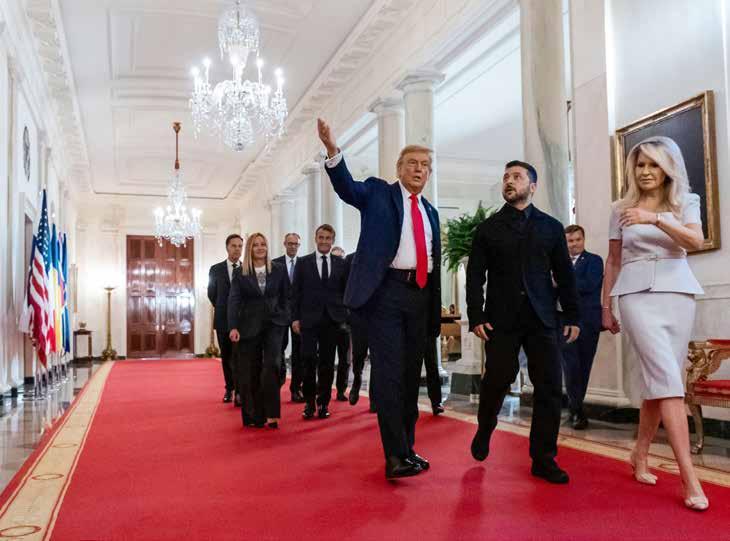 ▲ el presidente de estados Unidos, donald trump, camina por el Corredor transversal de la Casa Blanca, acompañado del presidente de Ucrania, Volodymir Zelensky, seguidos por el primer ministro de gran Bretaña, Keir starmer; el presidente francés, emmanuel Macron; el canciller alemán,