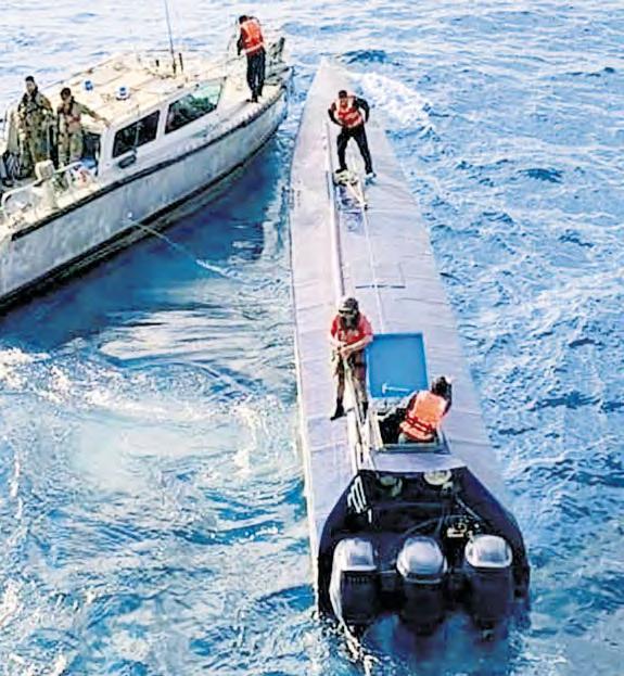 ▲ Elementos de la Marina interceptaron ayer en las costas de Manzanillo un semisumergible que transportaba 179 bultos con cuatro toneladas de cocaína y detuvieron a tres personas. Foto gabinete de seguridad CÉSAR ARELLANO / P 13