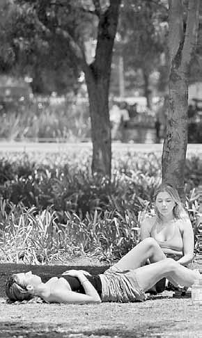 ▲ Anoche, a las 21:06 horas, comenzó el equinoccio de Primavera en el hemisferio norte. Sin embargo, las altas temperaturas se dejaron sentir desde los días de agonía del Invierno. En la Alameda Central, dos jóvenes tomaron ayer un baño de sol. Foto Jazmín Ortega Cortés