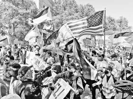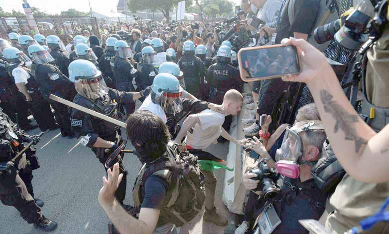 mientras adentro un grupo de 30 delegados “no comprometidos” con dar su voto a Kamala Harris exigieron que la candidata apoye un alto el fuego de inmediato. Esta primera de cuatro noches de cónclave fue el adiós de Joe Biden –a quien ovacionaron– y la bienvenida a su vicepresidenta. Foto Afp D. BROOKS Y J. CASON, CORRESPONSALES / P 19 Y 20