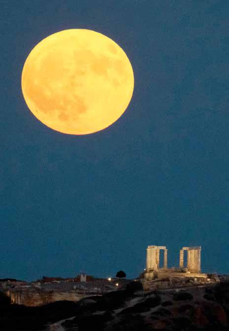 las más brillantes del año, mientras 3 por ciento son “azules”; es decir, la tercera de cuatro lunas llenas en una estación. La imagen, vista sobre el templo de Poseidón, en cabo Sunión, Grecia. Foto Afp