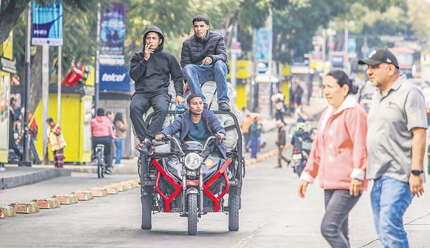 ▲ Vehículos eléctricos no regulados circulan en las calles e incluso banquetas del Centro Histórico de la Ciudad de México con exceso de pasajeros y de mercancías. Foto Alfredo Domínguez