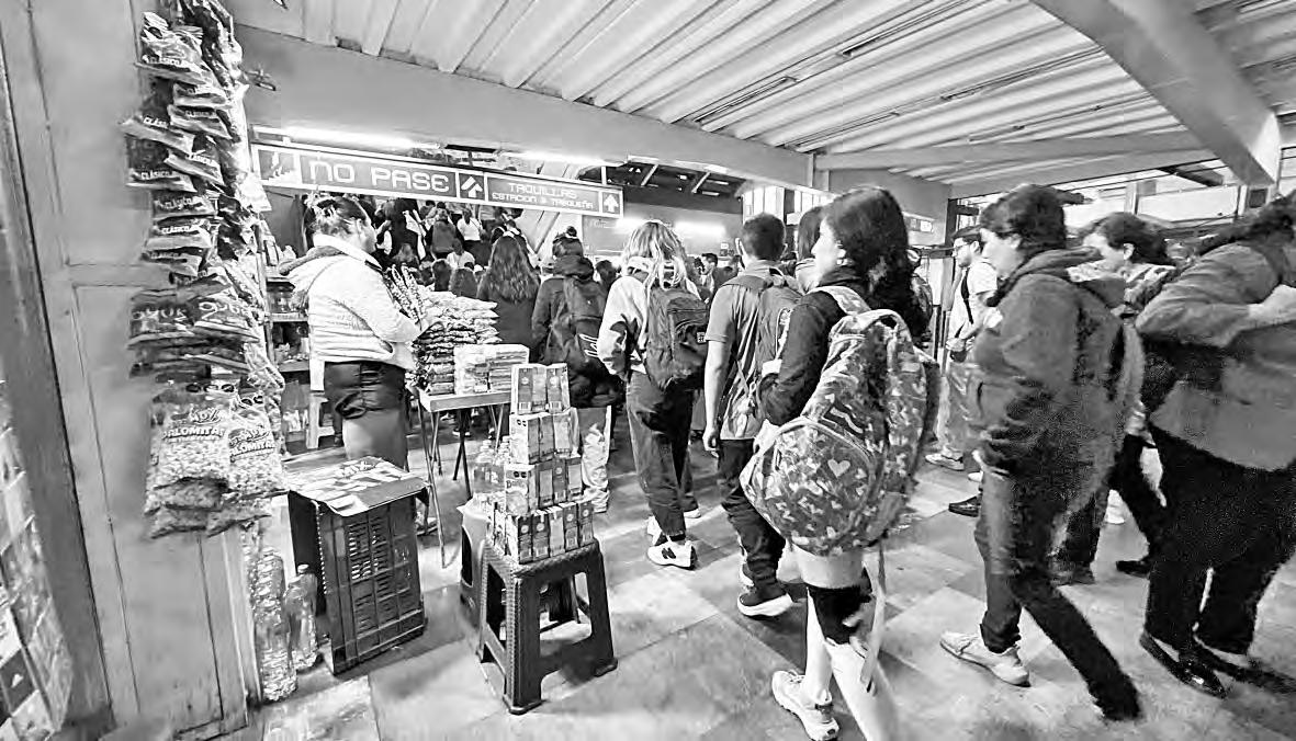 ▲ Frituras, cacahuates, aguas simples y jugos, entre otros productos, son exhibidos más allá del espacio asignado en cajas de plástico volteadas, pequeños bancos o incluso en el piso, lo que obstaculiza el paso de usuarios del Metro. Foto Yazmín Ortega Cortés