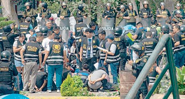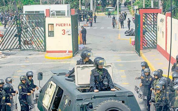 BRAULIO CARBAJAL / P 13 Policías allanan universidad de Perú; 200 detenidos ▲ Una tanqueta derribó una puerta de rejas y un numeroso contingente policial ingresó violentamente a la Universidad Nacional de San Marcos en Lima, la más antigua y grande del país. Los uniformados, armados con fusiles, también entraron en la residencia estudiantil. Además, impidieron que congresistas y abogados asistieran a los arrestados. Foto Afp