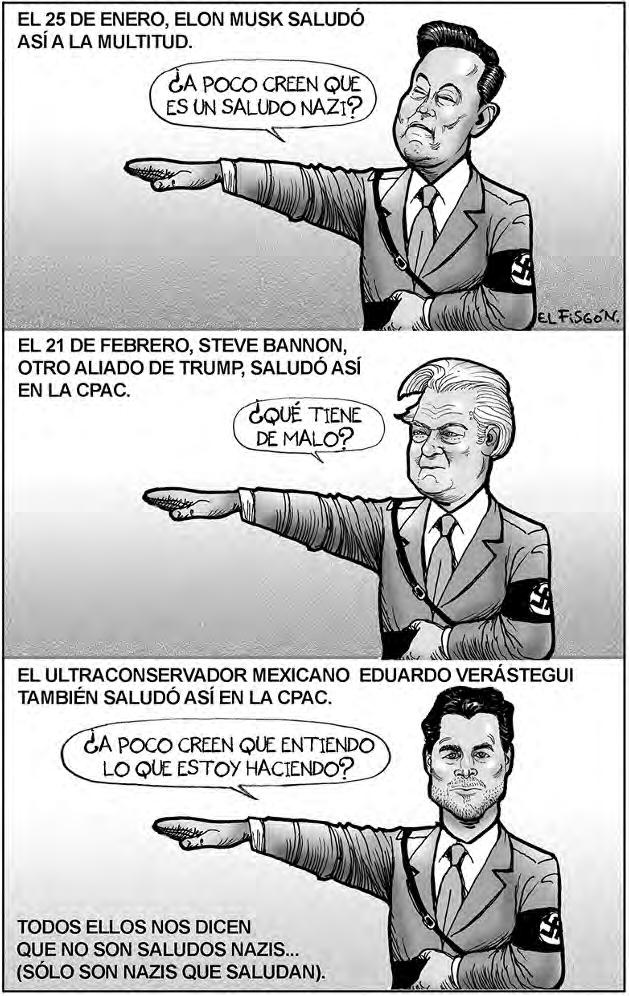 Musk portando la motosierra que le regaló el criptoestafador Javier Milei. Causa risa ver a un colaborador de la administración Trump, encargado del recorte de personal y asesor muy publicitado del presidente, posando con el aparato que sirve para serruchar árboles y su donante al lado. Pero también da miedo ver en manos de quién está la conducción del país más armado del mundo. Milei y Musk se encontraron en la Conferencia de Acción Política Conservadora que, bajo la inspiración del siempre ocurrente Donald Trump, concitó la participación de personajes afines al neofascismo, como Salvador Abascal, del partido español Vox y el vicepresidente de EU, JD Vance, quien alabó a su jefe diciendo que gracias él “Europa está al borde de la paz”. También aseguró que el acuerdo se hará entre Vladimir Putin y el mandatario estadunidense, pues en estos tres años de guerra “nadie ha avisado a los ucranios que no tienen camino a la victoria” (La Jornada, 21/02/25, pág. 16).