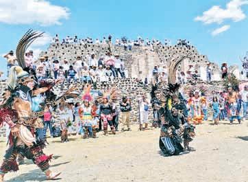 En las plazas del Sol y de la Luna hubo rituales y danzas prehispánicas. En otros sitios arqueológicos, como Chacaltzingo y Teopanzolco, Morelos, hubo poca asistencia. Foto Afp. corresponsales / cultura