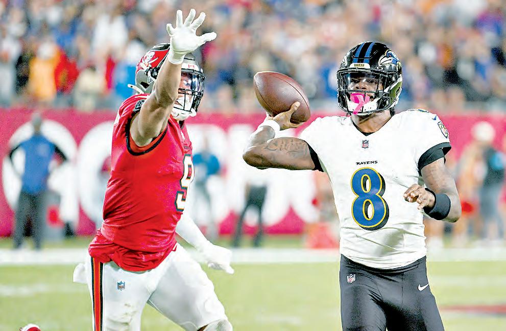 ▲ Lamar Jackson, mariscal de campo de Baltimore, es asediado por Tryoen-Shoyinka, defensivo de Bucaneros, durante el cotejo que regresó a Tampa. Foto Ap