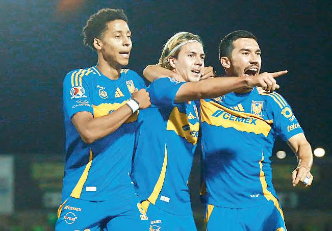 ▲ Sebastián Córdova (centro) anotó el gol al minuto 84 que le dio el triunfo 1-0 a su equipo. Foto del club Tigres