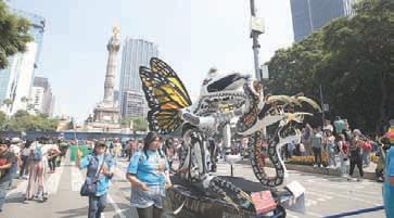 ▲ De las 11 de la mañana a las 3 de la tarde, más de 400 mil personas se dieron cita en el Centro Histórico de la Ciudad de México para ver el paso de las 160 formas y figuras de color fluorescente elaboradas por artesanos de la capital y los estados de México, Aguascalientes, Guerrero y Puebla, entre otros, las cuales partieron del Zócalo al Ángel de la Independencia. Las obras se quedan en exhibición sobre Reforma hasta el 13 de noviembre; los ganadores del concurso se darán a conocer el 29 de este mes. Entre los que más llamaron la atención se encuentran Nahual de los cuatro elementos, Tlatoani y Delirio. Foto Yazmín Ortega Cortés
