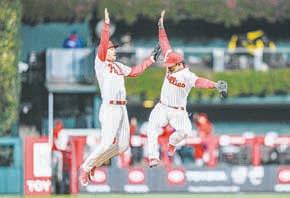 ▲ Bryson Stott (izquierda) y Jean Segura (derecha), de los Filis de Filadelfia, celebran la victoria del cuarto juego de la serie por el cetro de la Liga Nacional Foto Ap
