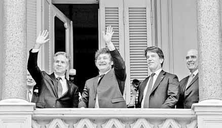 t Mientras se realizaban unas 500 protestas con el lema “el hambre no espera”, el presidente Javier Milei se reunió con el secretario de estado estadunidense, antony blinken, quien está de visita oficial. ambos salieron al balcón de la Casa rosada para saludar a unos turistas que recorrían la Plaza de Mayo, lo que produjo expresiones como “ahora somos colonia” o “traidores a la patria”. fotos ap y afp stella calloni, CorreSPonSaL / P 23