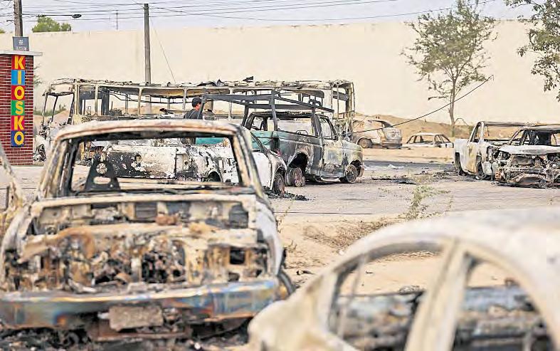 De más de 200 vehículos incendiados por el cártel Jalisco Nueva Generación, hasta ayer sólo 60 habían sido retirados de las calles de Puerto Vallarta. Habitantes de Guadalajara y otros municipios hicieron largas filas para comprar víveres, entre patrullajes de elementos de seguridad de los tres órdenes de gobierno. Miles de personas no se presentaron ayer a sus trabajos ni a clases. Foto Cuartoscuro JUAN CARLOS G. PARTIDA Y JAVIER SANTOS, CORRESPONSALES / P 4 Y 5