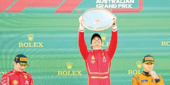▲ El español festeja junto su compañero Leclerc su dominio en el circuito de Albert Park. Norris, de McLaren, se lleva el tercer puesto. Foto Ap