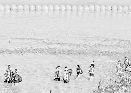 ▲ Venezolanos ondean una bandera blanca mientras son obligados a retirarse por miembros antidisturbios de la guardia nacional de Texas y la policía de carreteras que vigilan las orillas del río Bravo para impedir la llegada de más migrantes a estados Unidos, como se observa desde Ciudad Juárez. Foto afp arturo Sánchez, JeSSica Xantomila, carolina gómez, elba m. bravo / P 3 y 23