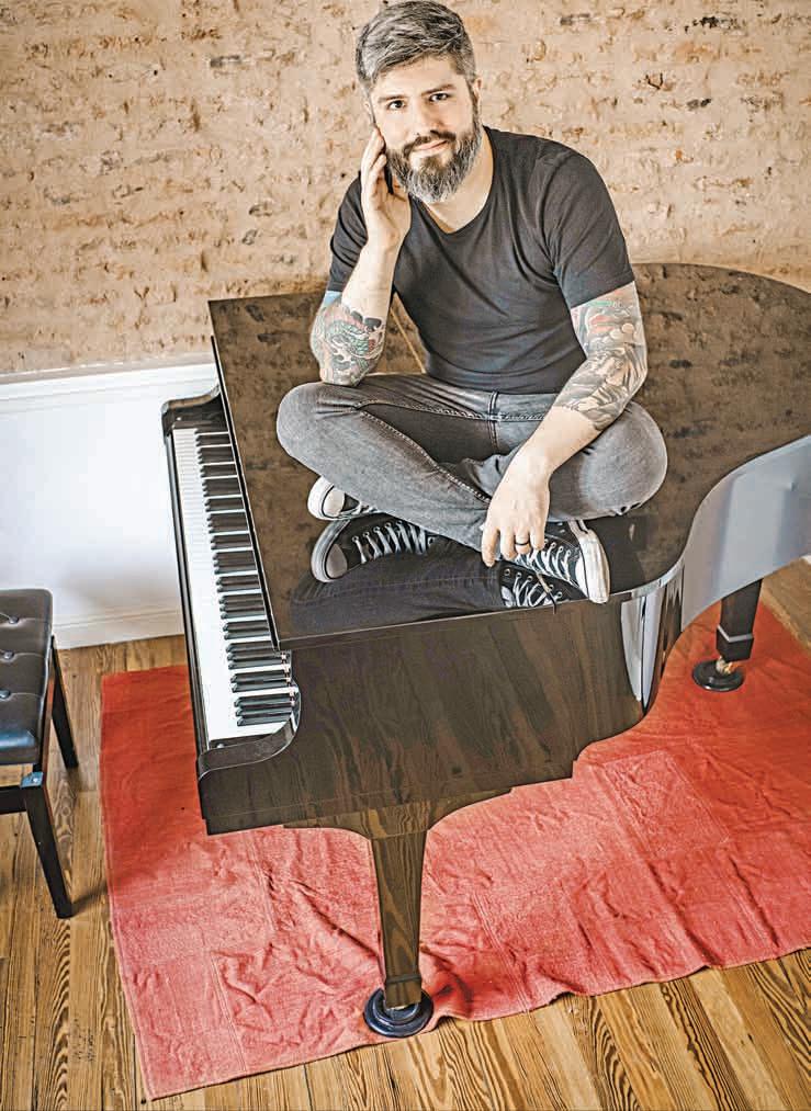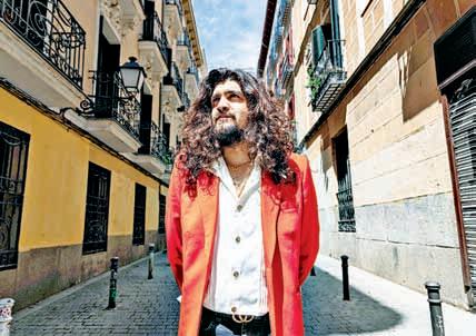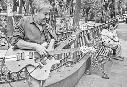 ▲ Un hombre muestra sus habilidades al tocar al mismo tiempo, a dos manos, dos guitarras eléctricas ante una pareja y transeúntes que