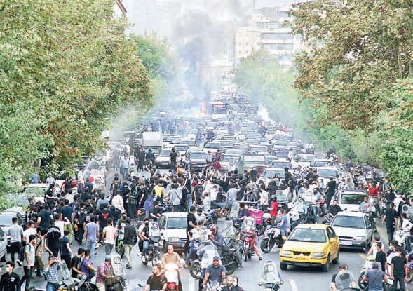 seguridad, quemaron patrullas y corearon consignas contra el oficialismo que obliga a las mujeres a usar velo. En respuesta, el gobierno movilizó a sus partidarios, quienes lanzaron consignas de “muerte a Estados Unidos e Israel”. La imagen, en Teherán. Foto Ap